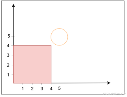 输入:X = 4, Y = 4, circles = [[5,5,1]]