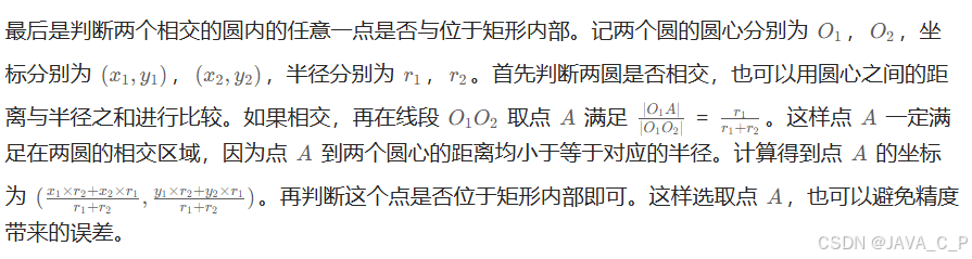 首先是判断点是否在圆内,这个我们可以用点到圆心的距离和半径进行比较。为了避免精度问题,我们可以将两边都进行平方操作。
