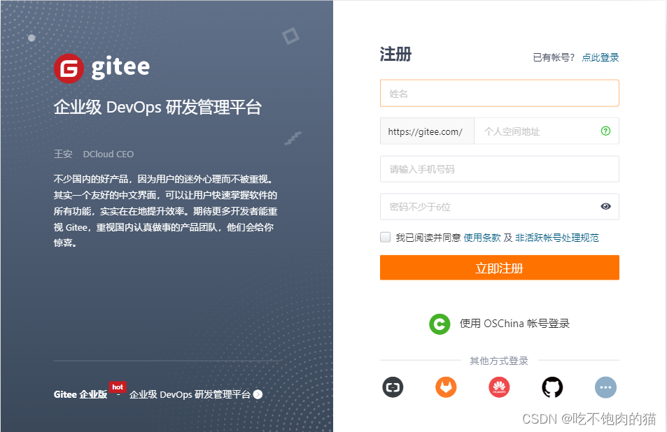 gitHub( 地址:https://github.com/ )是一个面向开源及私有软件项目的托管平台,因为只支持 Git 作为唯一的版本库格式进行托管,故名gitHub 码云(地址: https://gitee.com/ )是国内的一个代码托管平台,由于服务器在国内,所以相比于 GitHub,码云速度会更快 GitLab (地址: https://about.gitlab.com/ )是一个用于仓库管理系统的开源项目,使用Git作 为代码管理工具,并在此基础上搭建起来的web服务,一般用于在企业、学校等内部网络搭建git私服。 安全性高 银行项目 16G以上