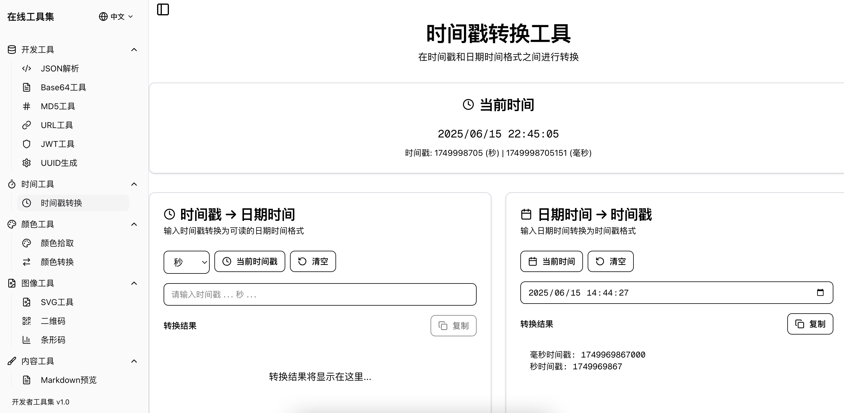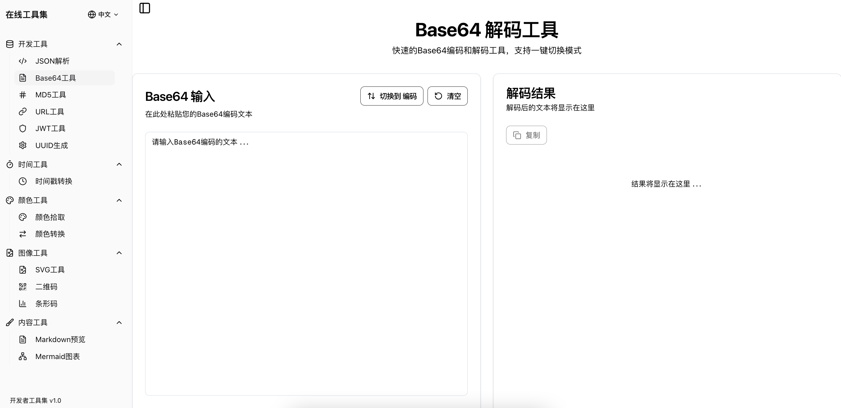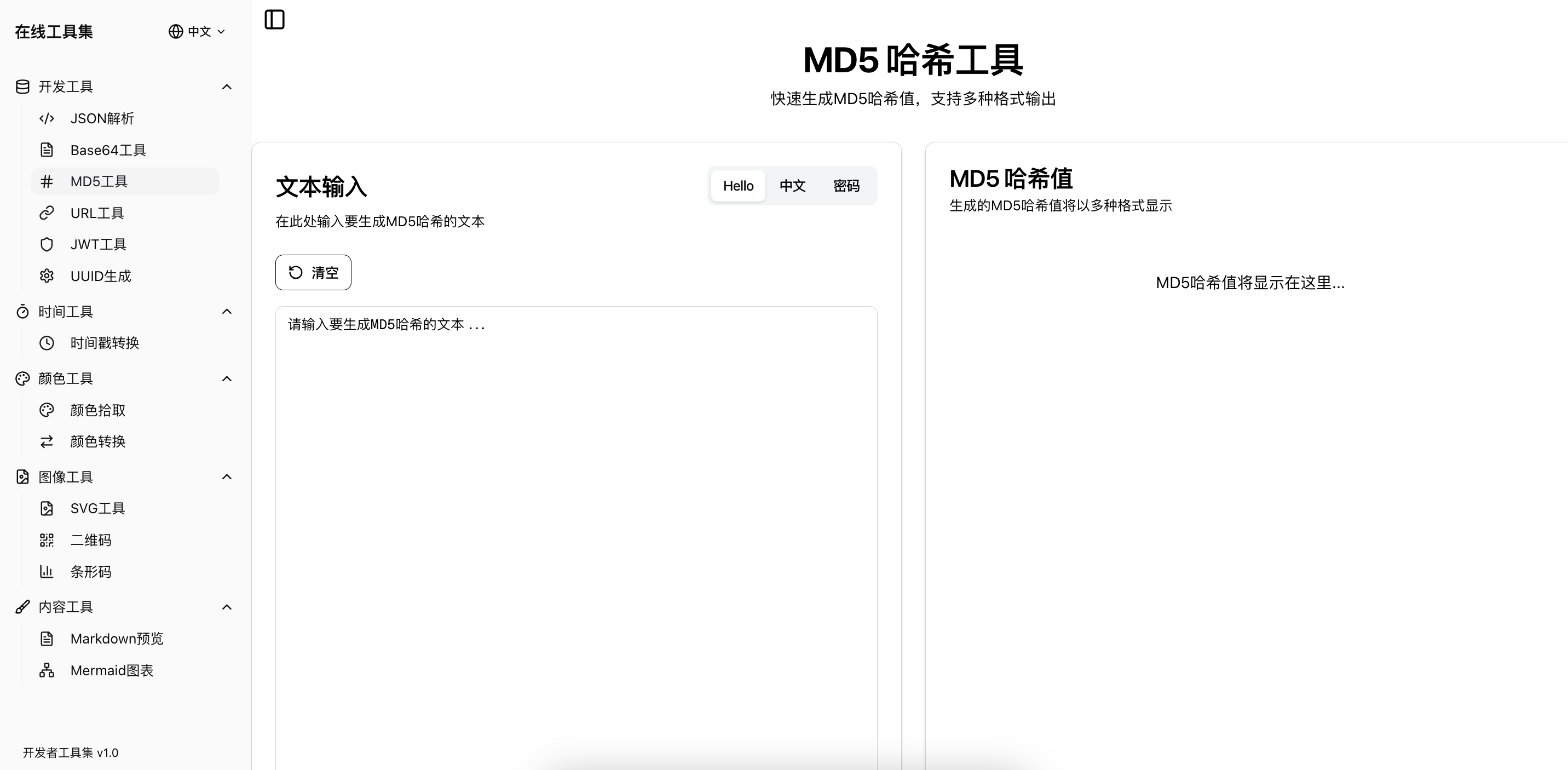 项目的初始想法很简单:把我自己常用的开发工具打造一个集多种实用工具于一身的网站,比如开发工具、文本处理、数据转换、颜色工具等。我的目标是让这个网站功能强大,同时界面友好、操作直观。其实在 AI 如此强大之前我已经开发过一个工具网站,但是代码需要完全自己编写,效率极低同时由于没有设计稿,最初出来的效果也不尽如人意,如下图: