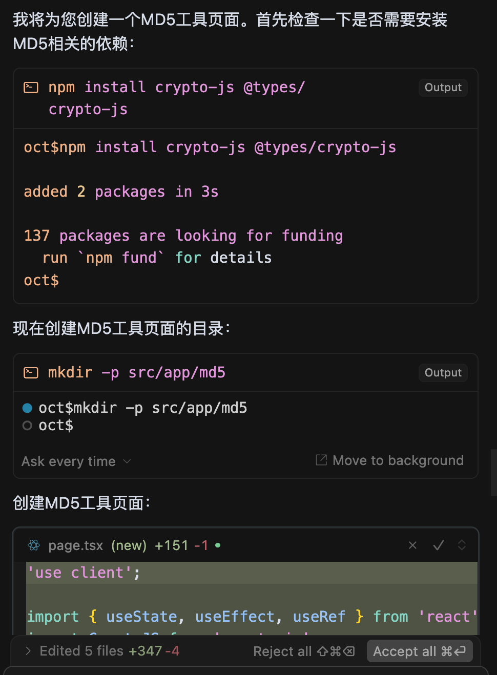 当有了 AI 辅助之后一切都不一样了,完成上述功能仅需要语言描述,如果报错就修复错误。我不必关心过程,只需要关注结果。