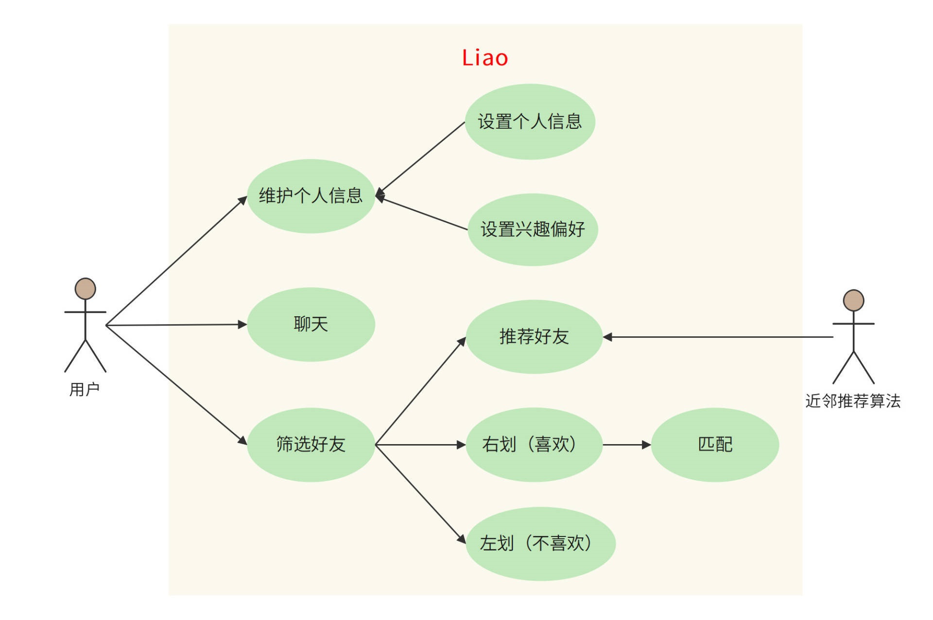 Liao的客户端是一个移动App,用户打开App后,上传、编辑自己的基本信息,然后系统(推荐算法)根据其地理位置和个人信息,为其推荐位置邻近的用户。用户在手机上查看对方的照片和资料,如果感兴趣,希望进一步联系,就向右滑动照片;如果不感兴趣,就向左滑动照片。