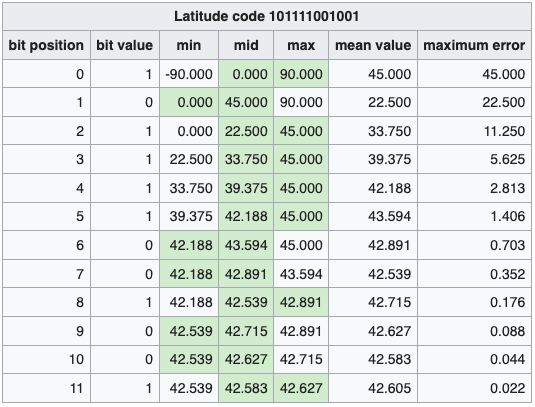 首先,分别针对经度和纬度,求取当前区间(对于纬度而言,开始的区间就是[-90, 90], 对于经度而言,开始区间就是[-180, 180])的平均值,将当前区间分为两个区间。然后用用户的经、纬度和区间平均值进行比较,用户经、纬度必然落在两个区间中的一个,如果大于平均值,那么取1,如果小于平均值,那么取0。继续求取当前区间的平均值,进一步将当前区间分为两个区间。如此不断重复,可以在经度和纬度方向上,得到两个二进制数。这个二进制数越长,其所在的区间越小,精度越高。