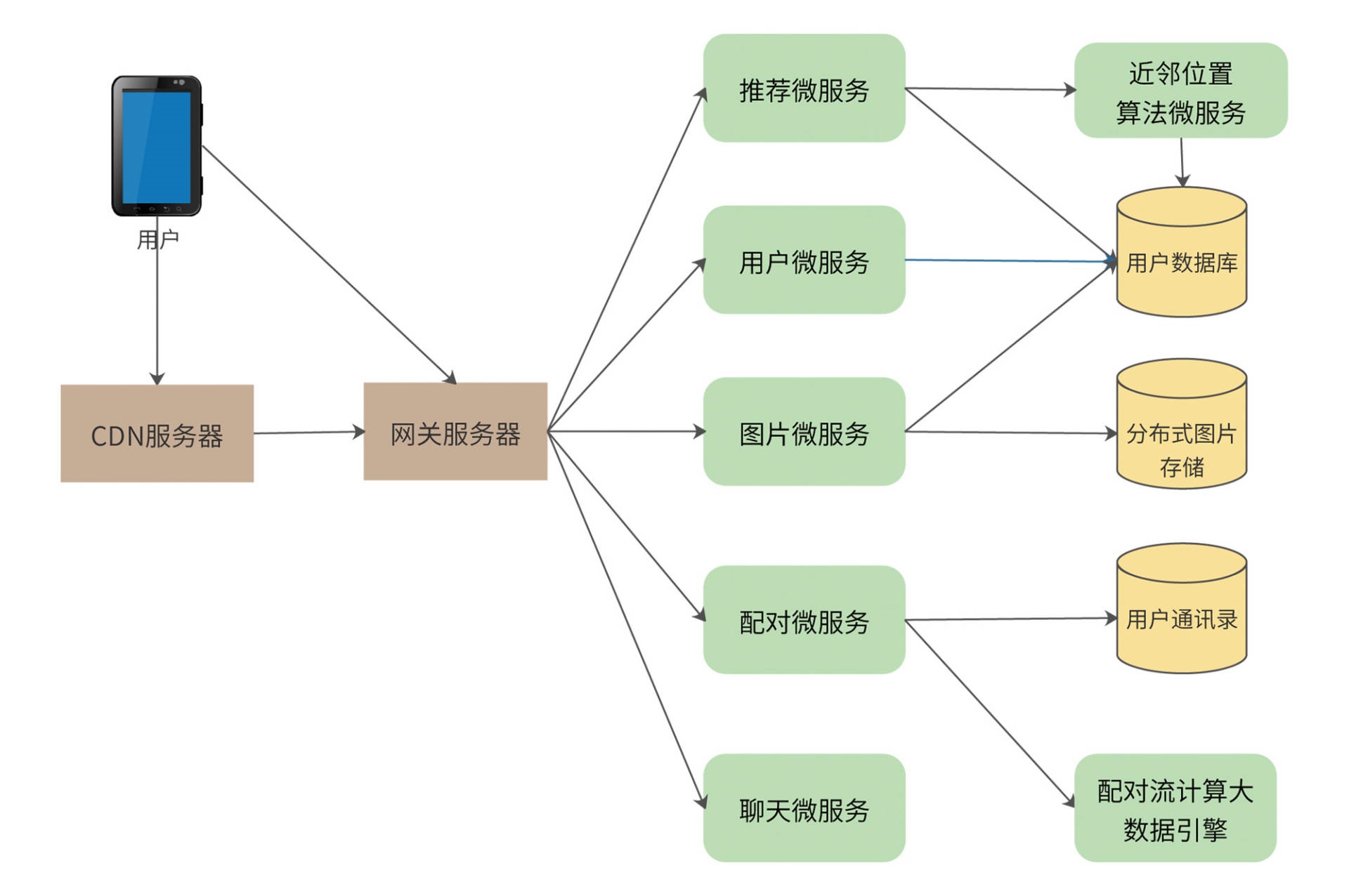 配对微服务负责将互相喜欢的用户配对,通知用户,并加入彼此的通讯录中。用户每次右划操作都调用该微服务。系统设置一个用户每天可以喜欢(右划)的人是有上限的,但是,对于活跃用户而言,长期积累下来,喜欢的人的数量还是非常大的,因此配对微服务会将数据发送给一个流式大数据引擎进行计算。