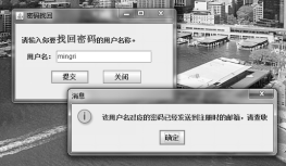 JOptionPane.showMessageDialog(null, "该用户名对应的密码已经发送到注册时的邮箱,请查收");