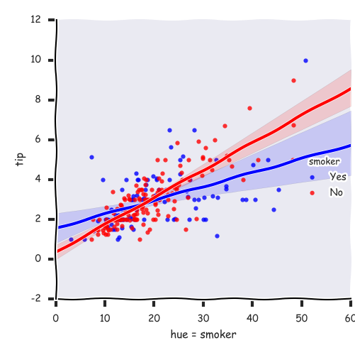 xoryvariables. The noise is added to a copy of the data after fitting the regression, and only influences the look of the scatterplot. This can be helpful when plotting variables that take discrete values.