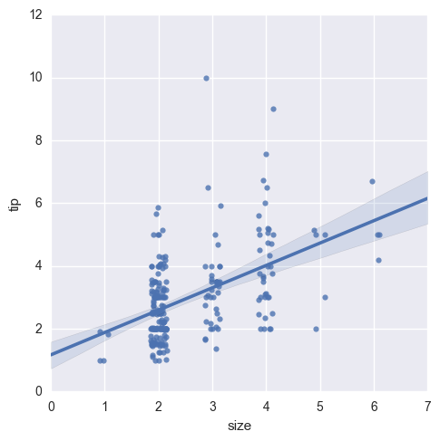sns.lmplot('size', 'tip', tips, x\_jitter=.15).savefig('picture4')