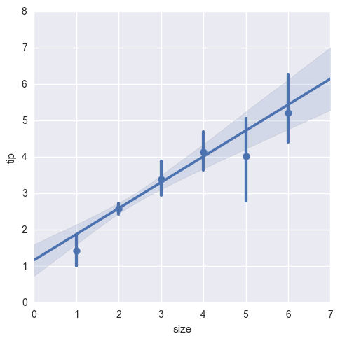 sns.lmplot('size', 'tip', tips, x\_estimator= np.mean).savefig('picture3')