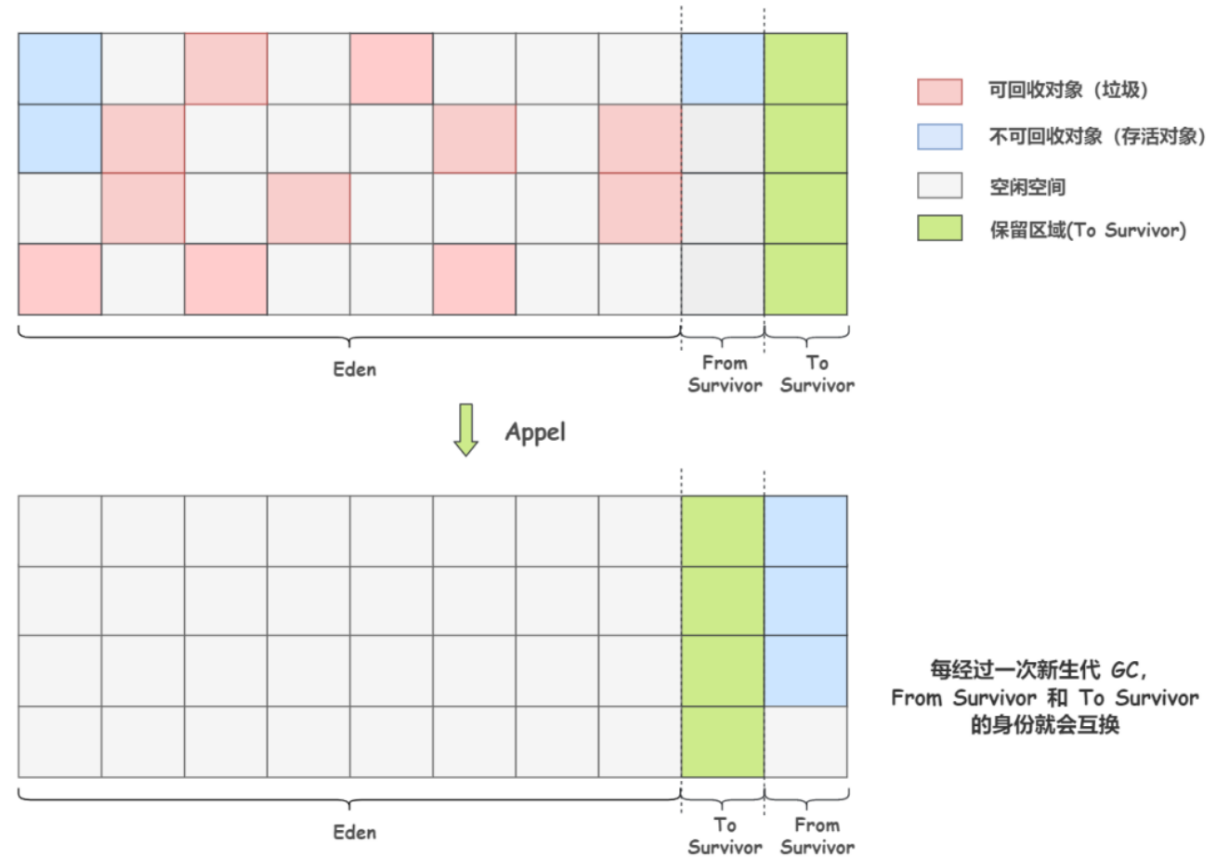 这两块 Survivor 空间也分别被称为 From Survivior 和 To Survivor,很显然,每经过一次新生代 GC,From Survivor 和 To Survivor 的身份就会互换。