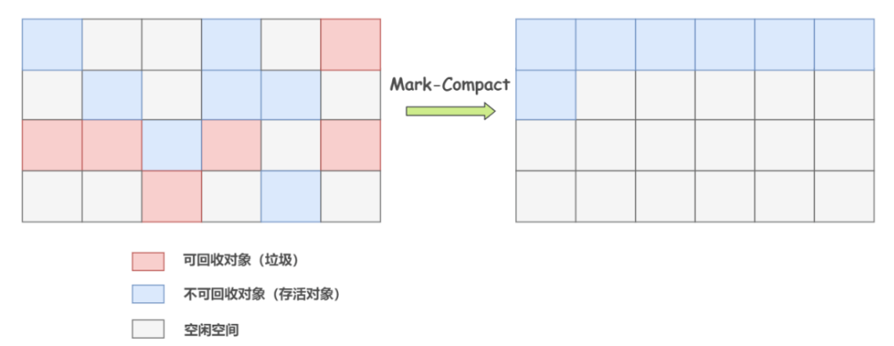 Mark-Sweep 算法与 Mark-Compact 算法的本质差异在于前者是一种非移动式的回收算法,而后者是移动式的。是否移动回收后的存活对象是一项优缺点并存的风险决策