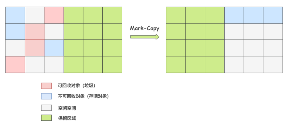 更简单的来说,标记-复制算法设计这么一大块的保留区域,目的就是为了把存活对象移动到这块区域上来,方便对之前的区域进行快速清理。