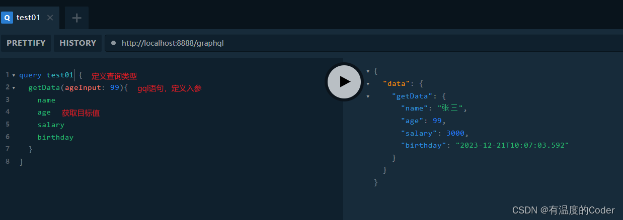 举例:使用gql查询一个接口 (前提是已经定义好接口和graphql schema)