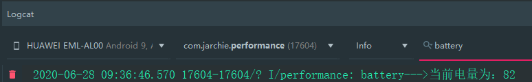 下面我们使用这种方式在项目中简单的实践一下,我们来打印一下当前手机的电量是多少: