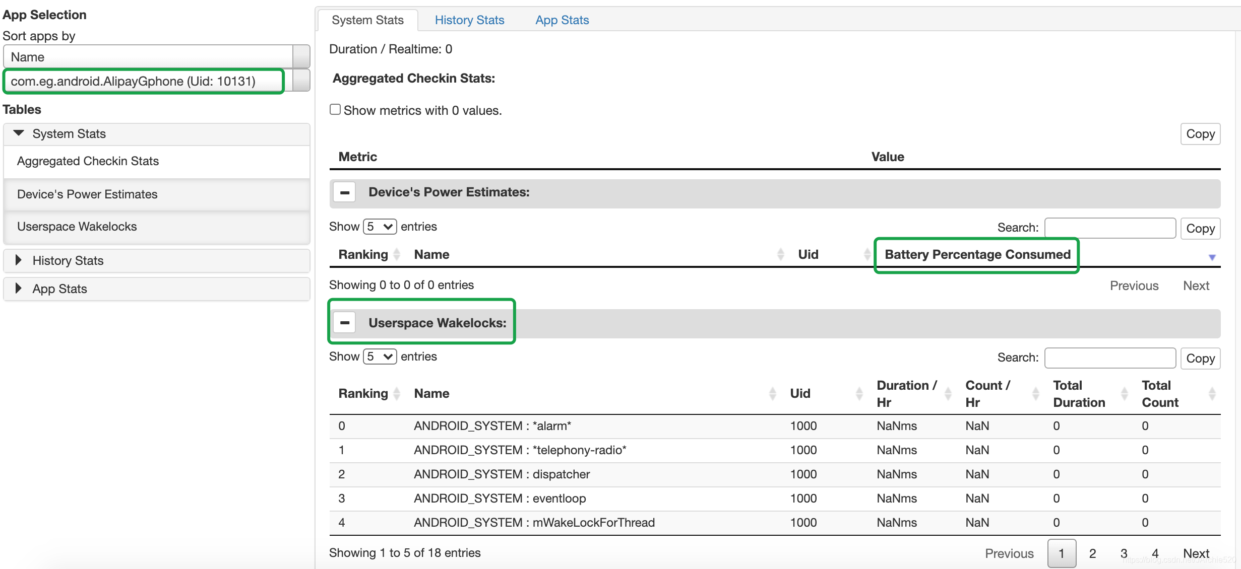 左下角有一个App Selection,这里就是你可以选择特定的App,展示的电量消耗就只有选定的App了,我这里为了演示操作的时间并不长,所以没有明显的数据,这里就随便选择一个支付宝的app,其中Battery Percentage Consumed展示的就是电量消耗情况,Userspace Wakelocks是展示的WakeLock的使用情况: