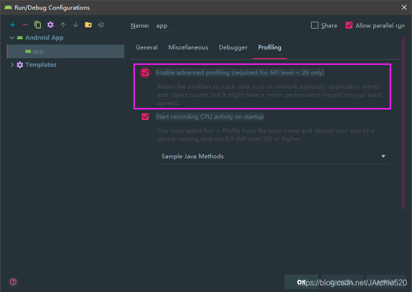首先我们打开Android Studio,然后在菜单栏选择Run--->Edit Configurations--->Android App--->app--->profiling,然后如下图勾选第一个Enable advanced profiling选项,点击APPLY--->OK即可: