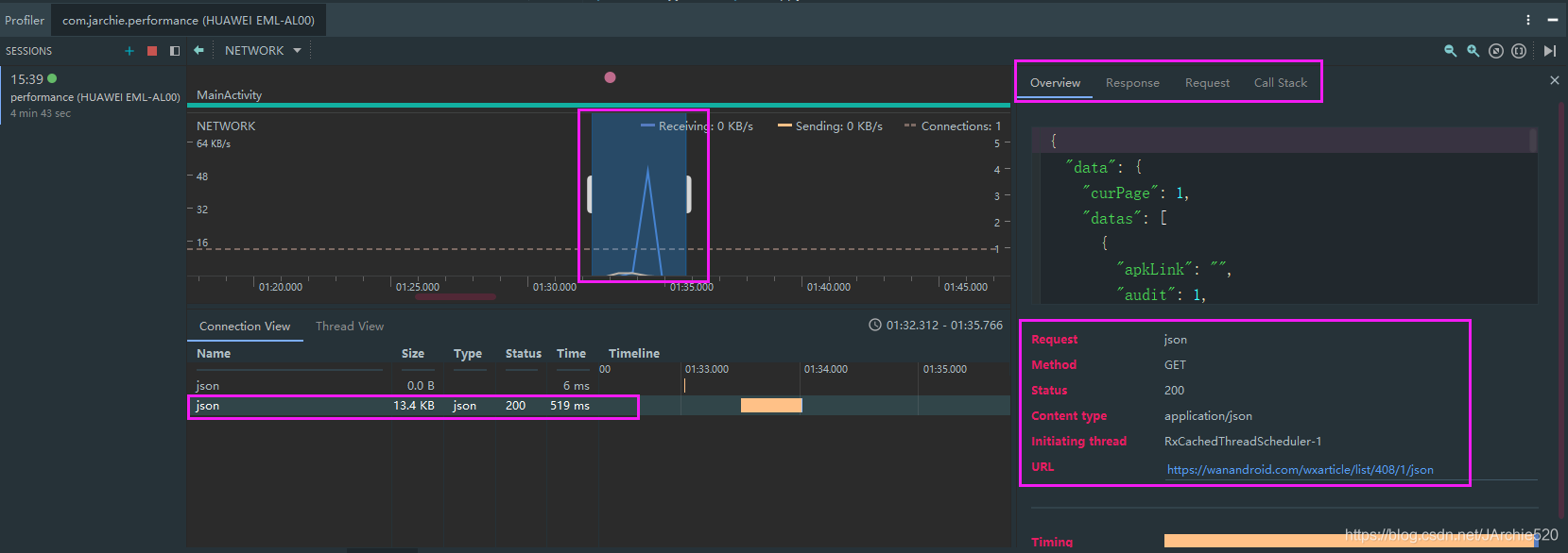 然后进入Network Profiler的视图,此时我发送一条网络请求,然后时间线上就会显示出来这条请求,现在我选中这条请求的一个时间范围,然后下方就会显示出这条请求的名称、大小、类型、状态、时间等,右侧会有这条请求的详细信息,你可以预览数据,我这里的是一个接口请求,如果有图片请求右侧预览界面也可以预览图片: