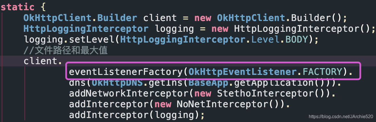 OkHttp给我们留了一个回调,叫做EventListener,我们可以自己实现一个EventListener,然后设置给每一次的网络请求: