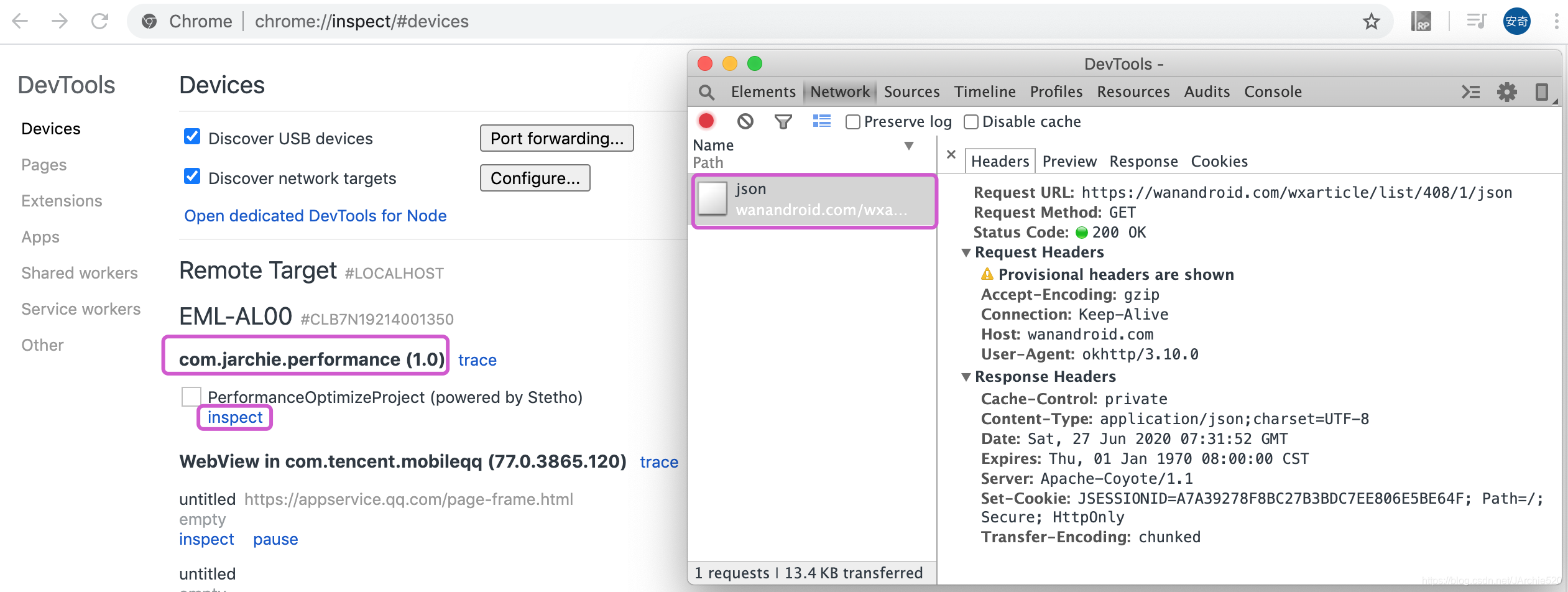 最后在Chrome浏览器(注意必须是Chrome浏览器)中输入chrome://inspect之后按照下图中框选出的位置点击即可开始抓包,这里可能会需要翻墙,因为我实际测试的时候发现不翻墙是报404的: