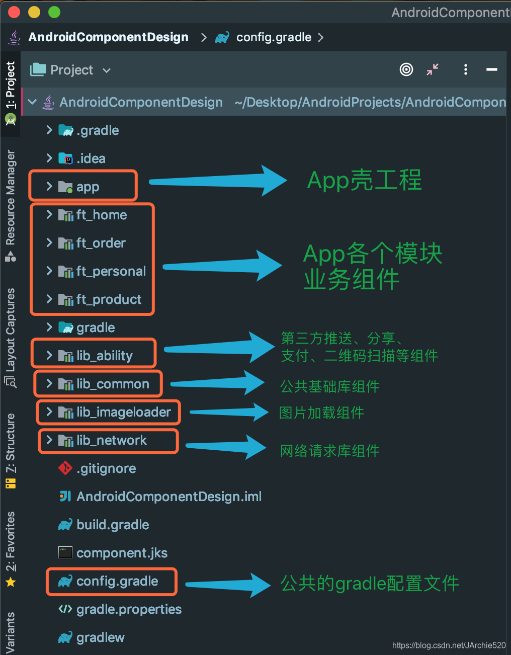 首先,app壳工程只是一个壳子,没有什么实际的业务,我们新建四个Android Library作为我们的四个业务组件,以ft_开头指代业务,将公共的业务再抽离出一个Common组件作为公共业务基础库,非业务组件我们以lib_开头,命名都做到见名知意就行了,实际开发中你还可以继续对组件进行拆分,比如:可以抽取网络请求组件network,图片加载组件imageLoader,各种第三方能力集成组件ability等等,最终我们按照这个原则将项目框架搭建起来,搭建完成之后的代码结构看起来还是很美观的,如下图所示: