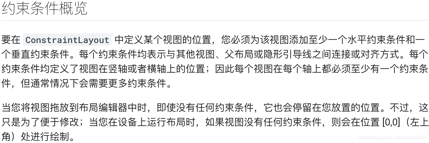 看完文档你就知道了,使用约束布局啊必须要在水平方向和垂直方向上各自至少有一个约束条件,并且像上面代码中那样什么约束条件都不加的话默认是在屏幕的左上角的,并且你设置的margin也是无效的,所以接下来我们就需要正式的了解一下约束条件该如何写喽!