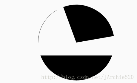 这里使用drawArc(float left, float top, float right, float bottom, float startAngle, float sweepAngle, boolean useCenter, Paint paint)方法来绘制弧形或扇形,通过查看源码我们可以发现,它底层是通过一个椭圆来描述弧形的,其中参数left、top、right、bottom是所在的椭圆的边界坐标,startAngle是弧形的起始角度,X轴的正向为0度的位置,顺时针为正逆时针为负,sweepAngle是弧形范围角度,useCenter表示是否连接到圆心,为true表示连接,就是扇形,为false表示不连接,就是弧形。具体使用方式见代码: