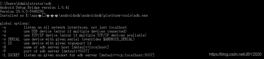 检查Android SDK是否安装成功:安装及环境变量配置完成之后的命令行中输入adb回车,显示如下,说明Android SDK安装成功。