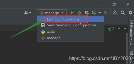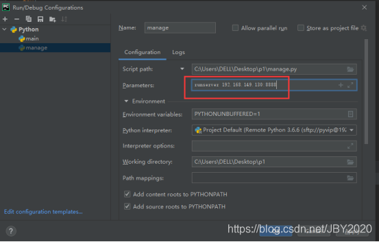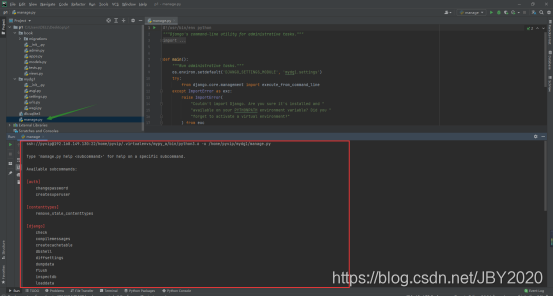 点击运行manage.py文件,结果如下,需要我们配置ip和端口
