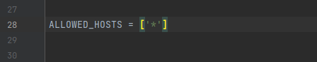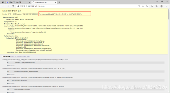 点击控制台中的蓝色地址,出现如下网页,其中的提示信息说明需要配置运行访问的地址,配置方法在,settings.py文件中添加ALLOWED_HOSTS的值并保存修改,添加为 * 时,表示允许所有可连接的地址进行访问