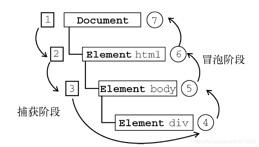 DOM2级事件”规定的事件流包括三个阶段:事件捕获阶段、处于目标阶段和事件冒泡阶段。 首先发生的是事件捕获,为截获事件提供了机会。然后是实际的目标接收到事件。最后一个阶段是冒泡阶段,可以在这个阶段对事件做出响应。以前面简单的HTML 页面为例,单击<div>元素会按照下图所示顺序触发事件。