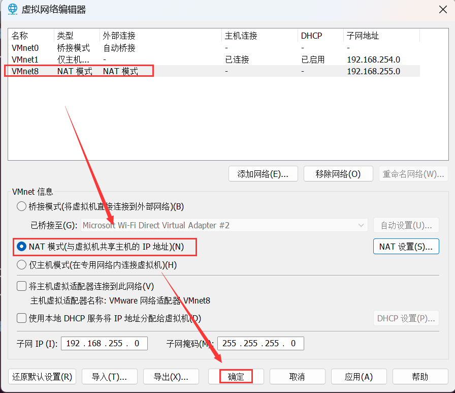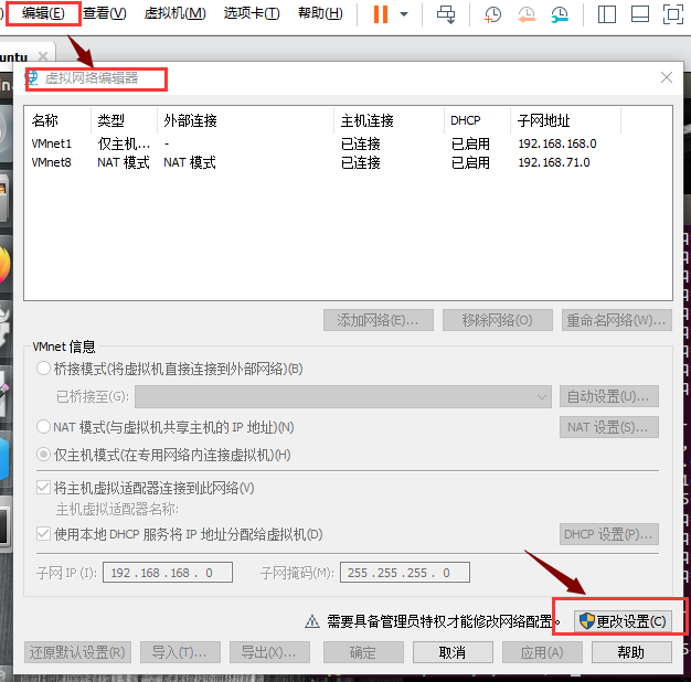 - (1).编辑->虚拟网络编辑器->更改设置->选择vmnet8->nat模式->确定。