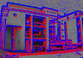 下面这幅图展示了实际事件相机拍摄的数据,红色和蓝色分别表示当前像素亮度的增加或减小。这幅图是将一段时间内的事件流累积获得的一组事件。