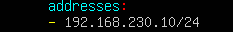 第一个addresses是设置ip的,如图,注意这里不能设置与你的子网ip一模一样,否则不能联通外网,我的子网ip最后一个是0,而这里的addresses最后一个我设置为了10,后面的/24在前面有说过,因为我的子网掩码是24位的,所以这里也要设置成/24