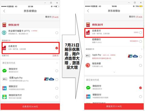 点击率=点击数/曝光数。点击率越高说明曝光出来的东西对用户吸引力越大,从如下页面可以看到,首推支付在未选中之前优惠点是隐藏的,因此用户注意力会集中到银行卡支付中的“618单单减”优惠,首推支付注意力热度很低。在移动端如此小的页面上如何突出重点抓住用户眼球极为重要。优惠点露出后,点击率提升明显,从该渠道激活量绝对值来看,激活量提升了一倍左右。在用户碎片化的时间内给用户关键有效信息,提高用户点击率,给用户一键开通的极致体验,显得极为重要。