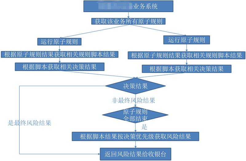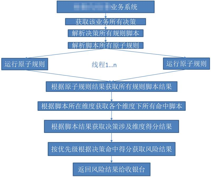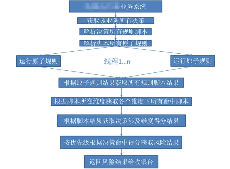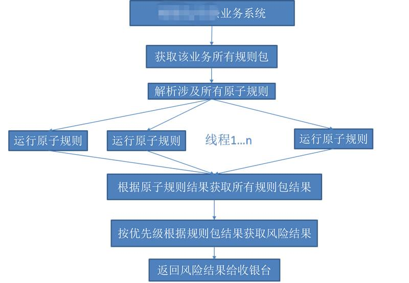 上游系统调用天盾引擎后,引擎获取该业务的规则包,并解析规则,并行运行原子规则,最终获取结果返回收银台。
