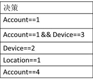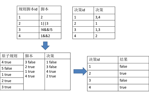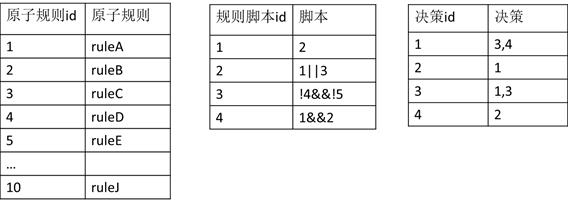 使用脚本id代替维度及维度得分,决策只支持”与”的逻辑关系,上图中根据优先级获得的原子规则为4,5,1,2,3。