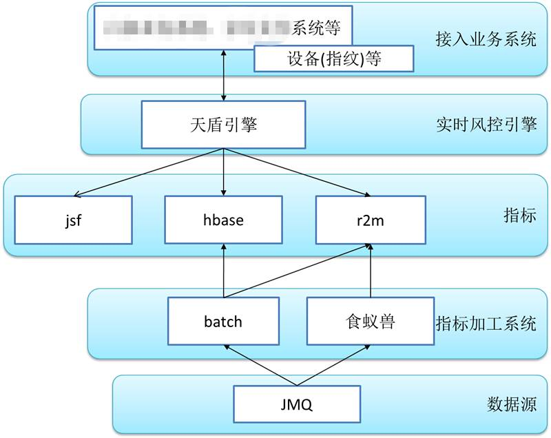 接入的业务系统调用天盾时,天盾实时获取指标,指标通过指标加工系统生成,系统根据指标实时计算风险结果,返回上游系统。