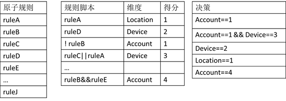 在天盾2.0系统中,维度和维度得分未起到实质作用,只是增加了配置和运行复杂度,在3.0系统中去除了维度,重新定义原子规则,规则脚本,与决策的配置关系,下图为天盾3.0决策配置关系