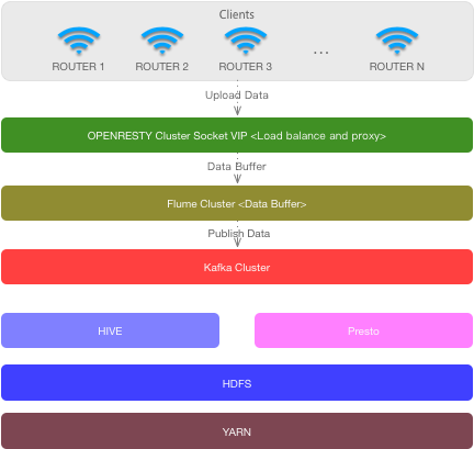 WIFI探针技术已经在一些大的互联网公司有着广泛的应用,可在用户无感的情况下实现数据交换。例如WIFI探针打卡、流量统计、客群分析等。WIFI探针是一套定制化的路由器系统,随着终端设备的增加,探针的数据量有着惊人的增长。每个WIFI设备会在每秒钟产生几KB到数百M不等的数据量,再考虑到数据安全策略等因素,数据网关接口的设计至关重要,需要有能力应对较大的流量冲击。探针系统架构设计如下: