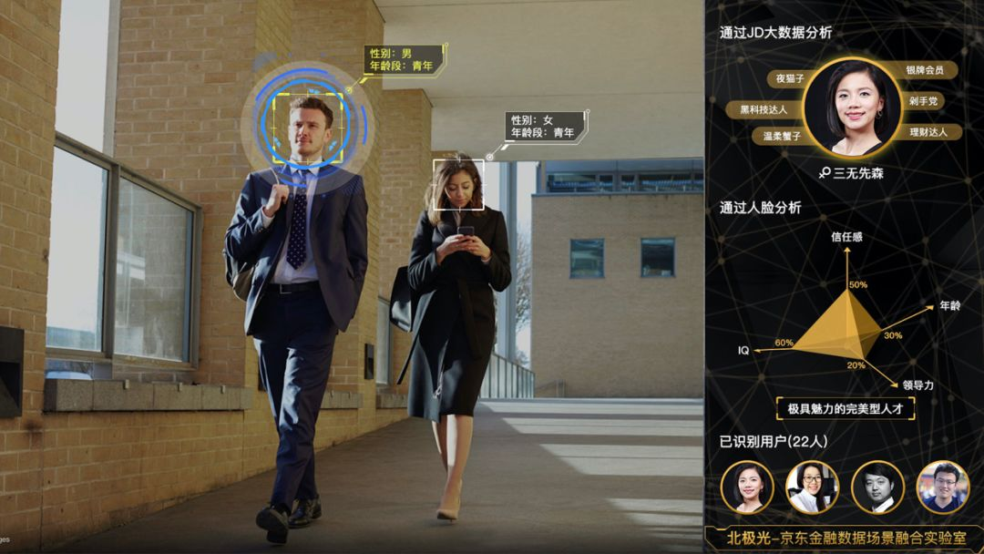 通过机器视觉和深度学习技术,实现用户进入即识别,结合多种模型算法分析顾客性别、年龄、心情、颜值、领导力类型等,千人千面智能推荐,并可进行重点用户路径跟踪,融合京东大数据进行匹配分析,做纵深的用户洞察分析。