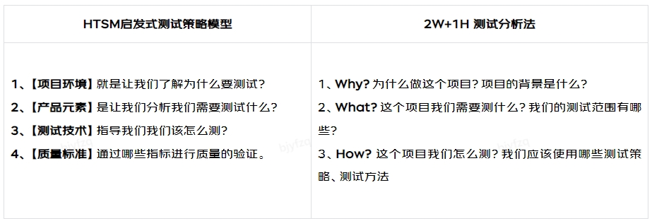 下面是HTSM和2W1H分析法进行的对比,通过对比可以看出HTSM可以与2W1H进行对应,通过分析项目环境,了解为什么测试这个项目,了解项目背景;通过分析产品元素,确定了我们的测试范围,明确我们要测什么;然后通过测试技术和质量标准指导了我们该怎么去测。