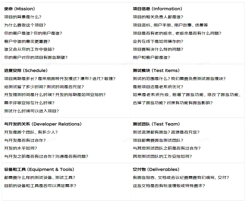 在HTSM模型中,项目环境、产品元素、质量标准、测试技术每一项都列出了很多子项;其中【项目环境】和【产品元素】不需要按照模型提供的子项进行全量的分析,所以大家可以作为参考,挑选对自己有用的信息进行分析即可。