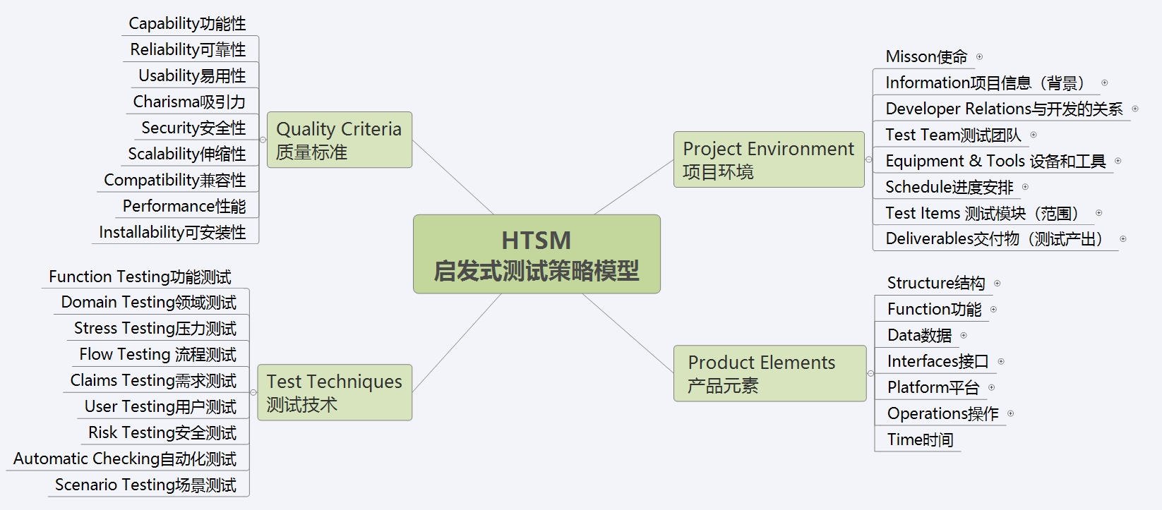 下面分别讲解HTSM的四个领域:项目环境、产品元素、质量标准、测试技术。大家也可以按照这个顺序去使用HTSM,按照2W1H的方法去分析,参考HTSM提供的子项和经验,最终形成完整的测试方案。
