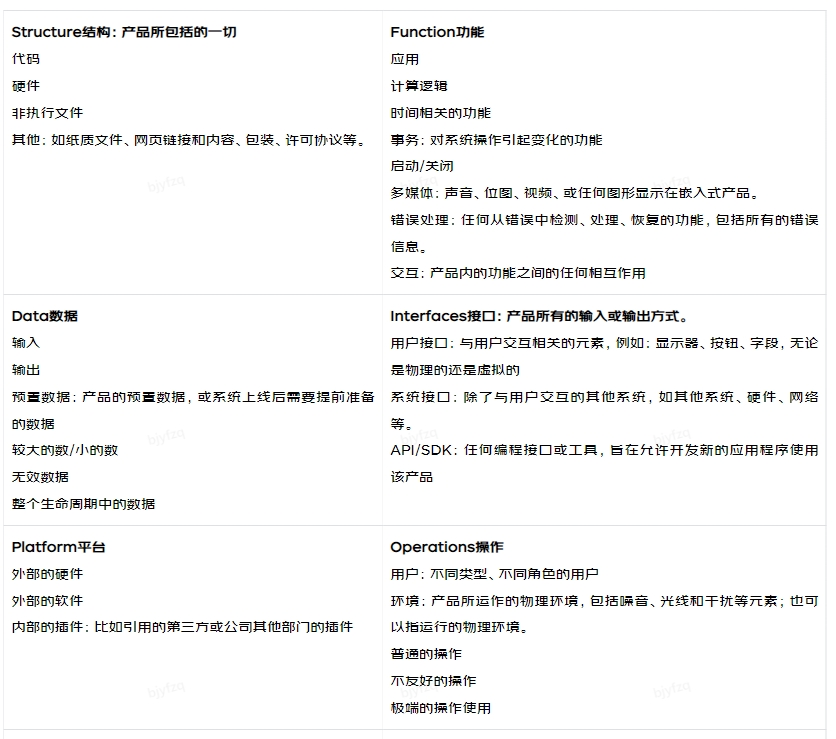 测试第二步:【产品元素】,就是我们计划要测试的内容;测试人员必须保证覆盖所有的产品元素,而且不仅仅是我们所看到的部分。