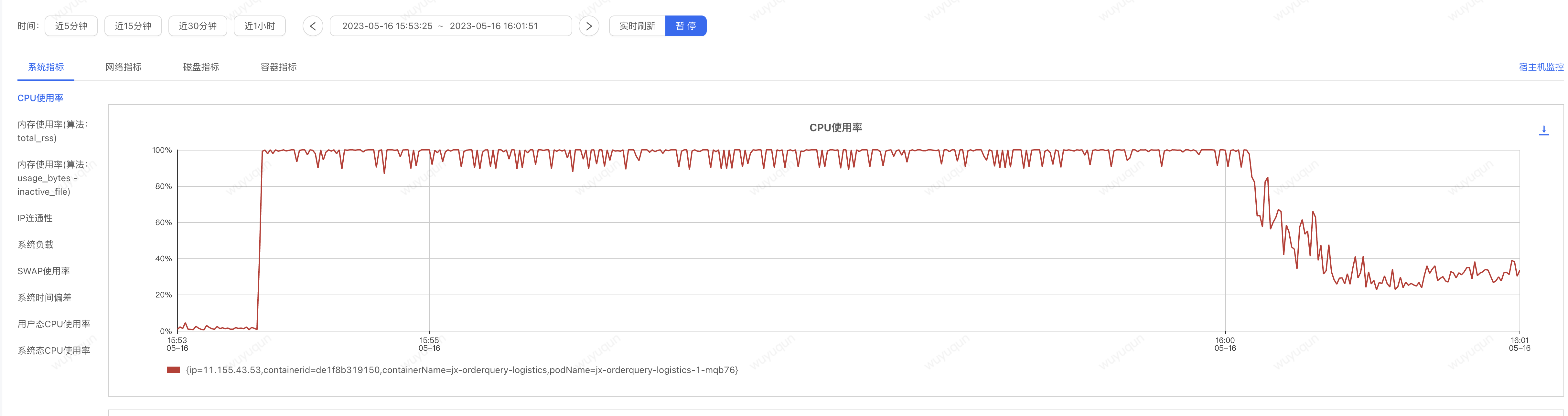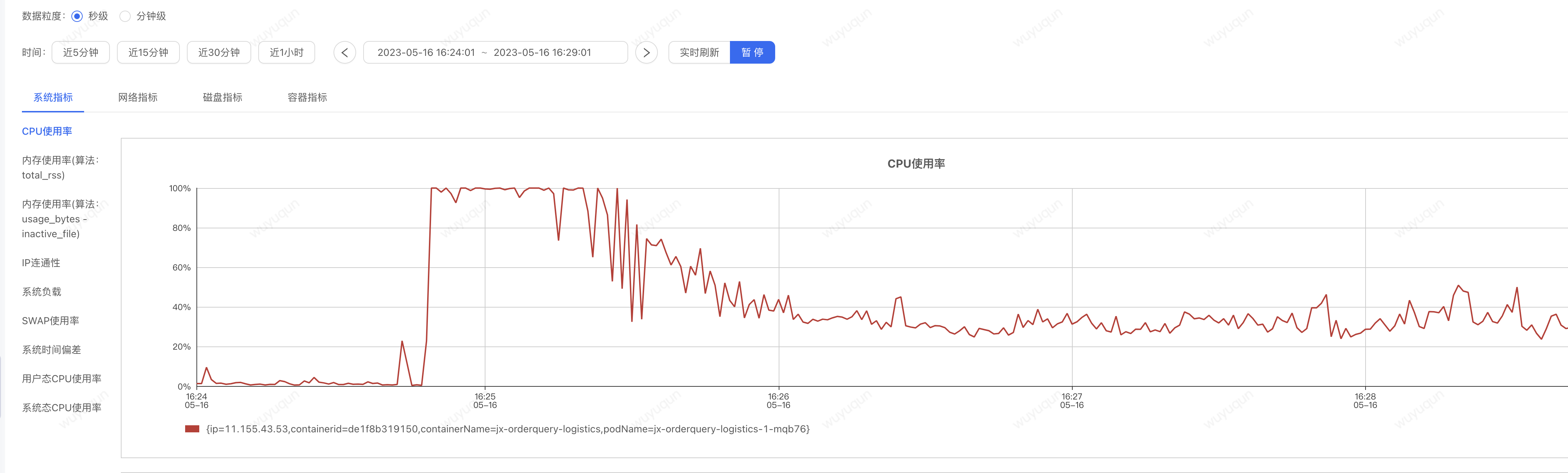 压测端在高CPU阶段QPS上不去,仅在50-100之间波动,CPU恢复之后,QPS迅速上涨到400,整个过程Sentinel无熔断发生