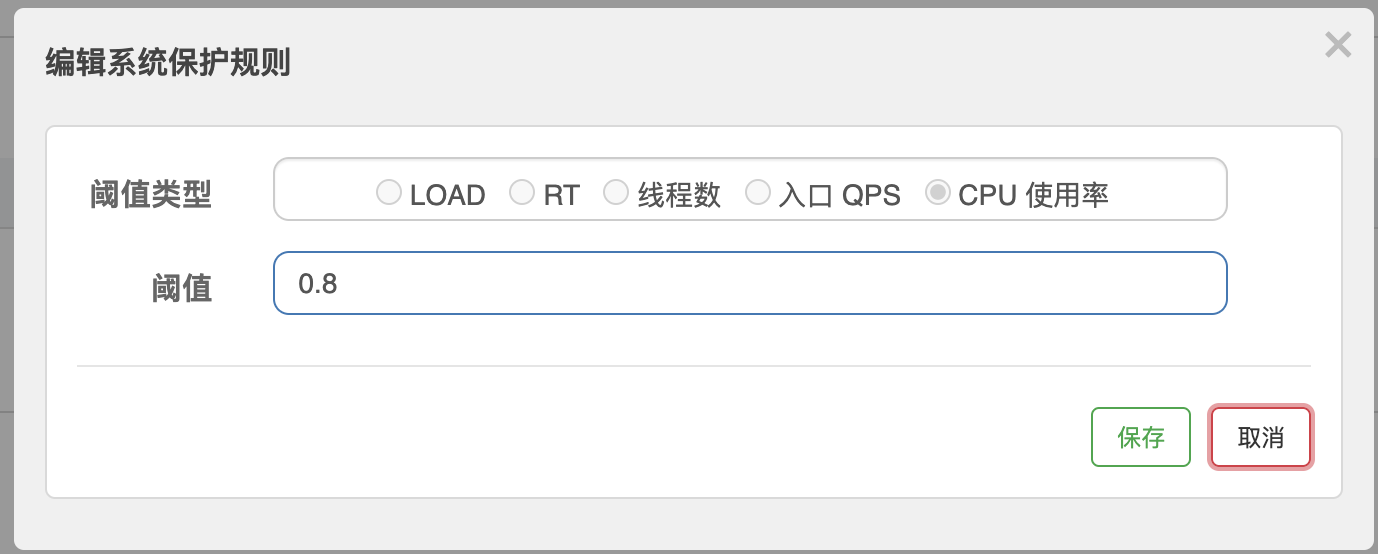 针对如上情况,我们尝试使用Sentinel的系统规则,在系统负载过高的时候自动进行熔断,避免系统过载导致被击穿,我们设置一条CPU不超过80%的系统保护规则,如下,通过后面几个过程,我们对比一下这条规则对我们系统的影响