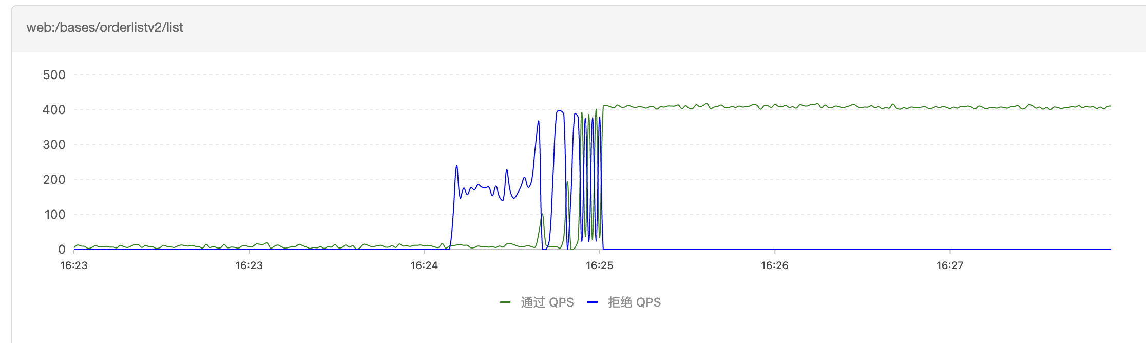 我们再压测一下冷启动状态下设置系统保护规则的情况(压测前重新启动一下Java进程,让应用处于“冷启动”的状态),看如下监控图,只要系统不进入“准崩溃状态”,那么系统会很快就恢复到正常状态,从下面图上看冷启动下对系统的影响只有前一分钟