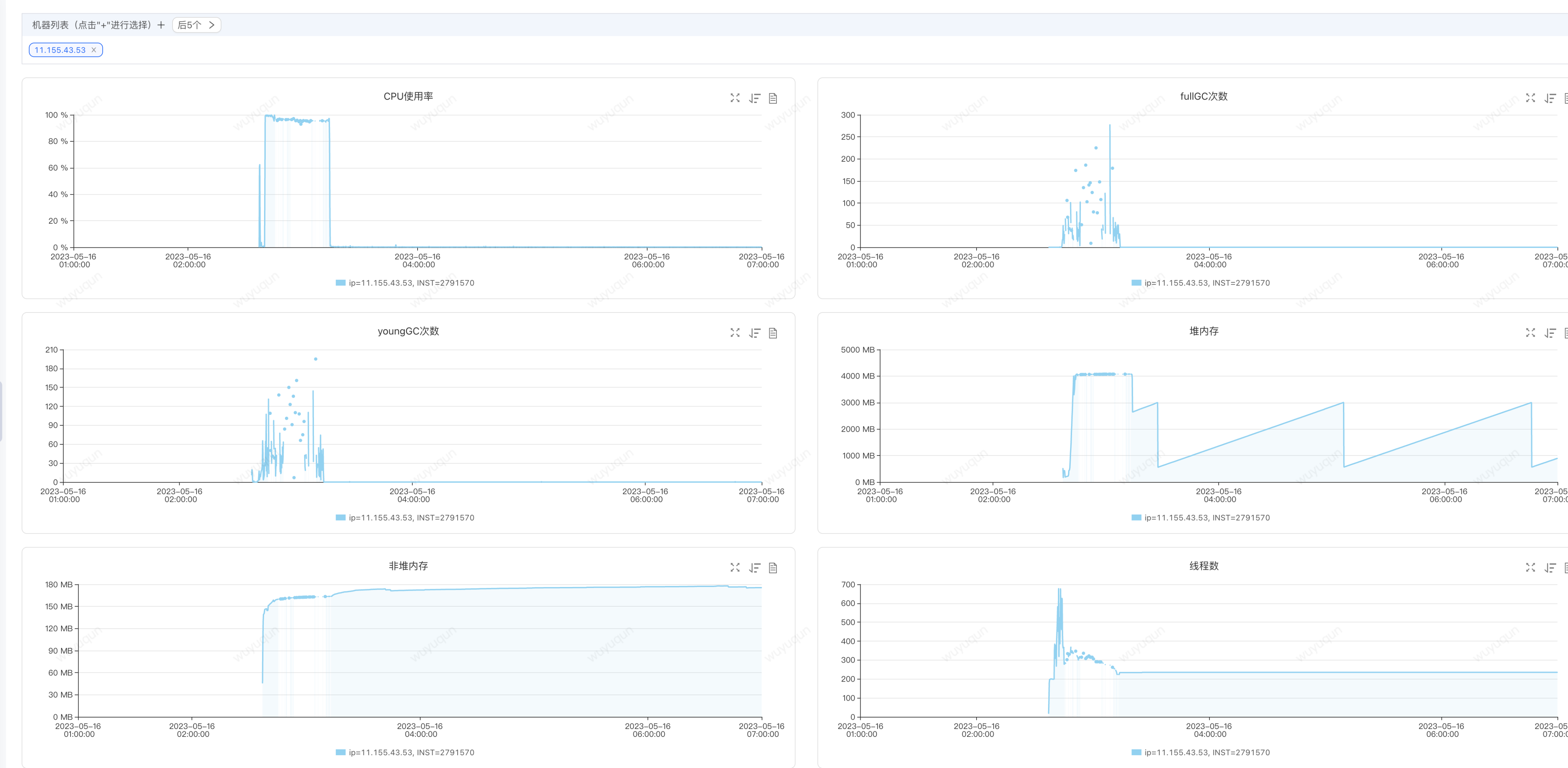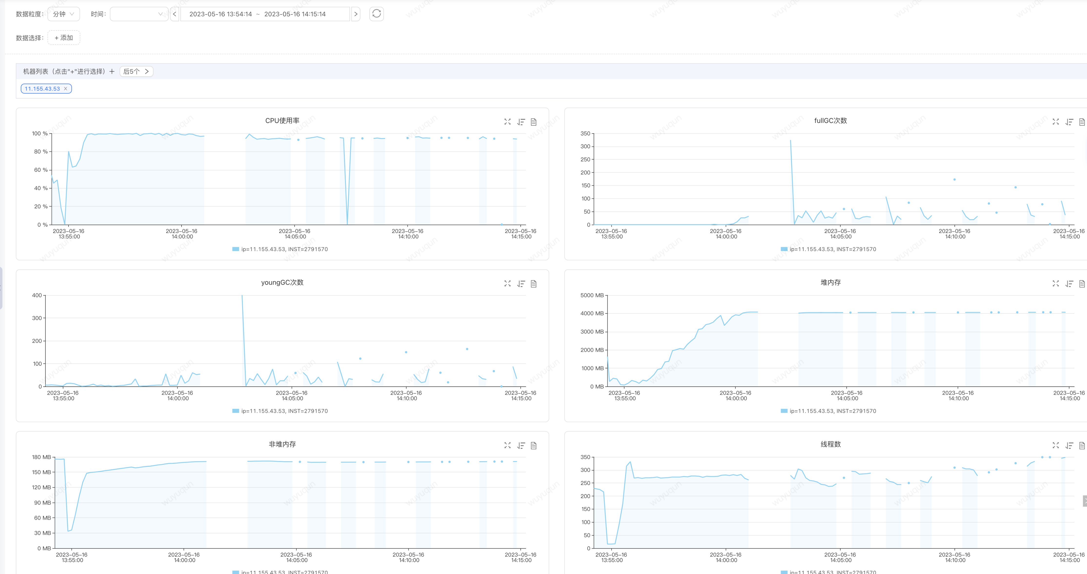 在今天ForceBot全链路压测中,有位同事负责的服务做Serverless扩容(负载达到50%之后自动扩容并上线接入流量)中,发现新扩容的机器被击穿,监控如下(关注2:40-3:15时间段的数据),我们可以看到,超高CPU,频繁FullGC,并且每次FullGC之后对内存并不回收(见FullGC时间段对应的堆内存的曲线,是一条横线)