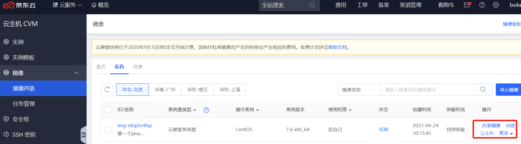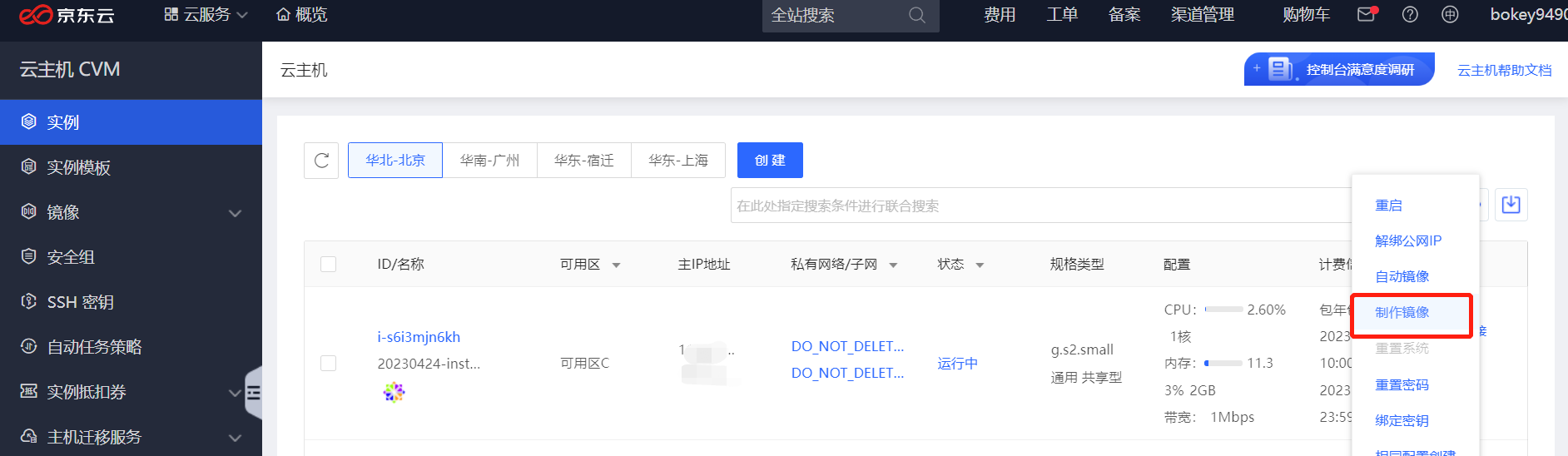 访问云主机控制台,选择第一台搭建好环境的云主机,点击操作中的制作镜像