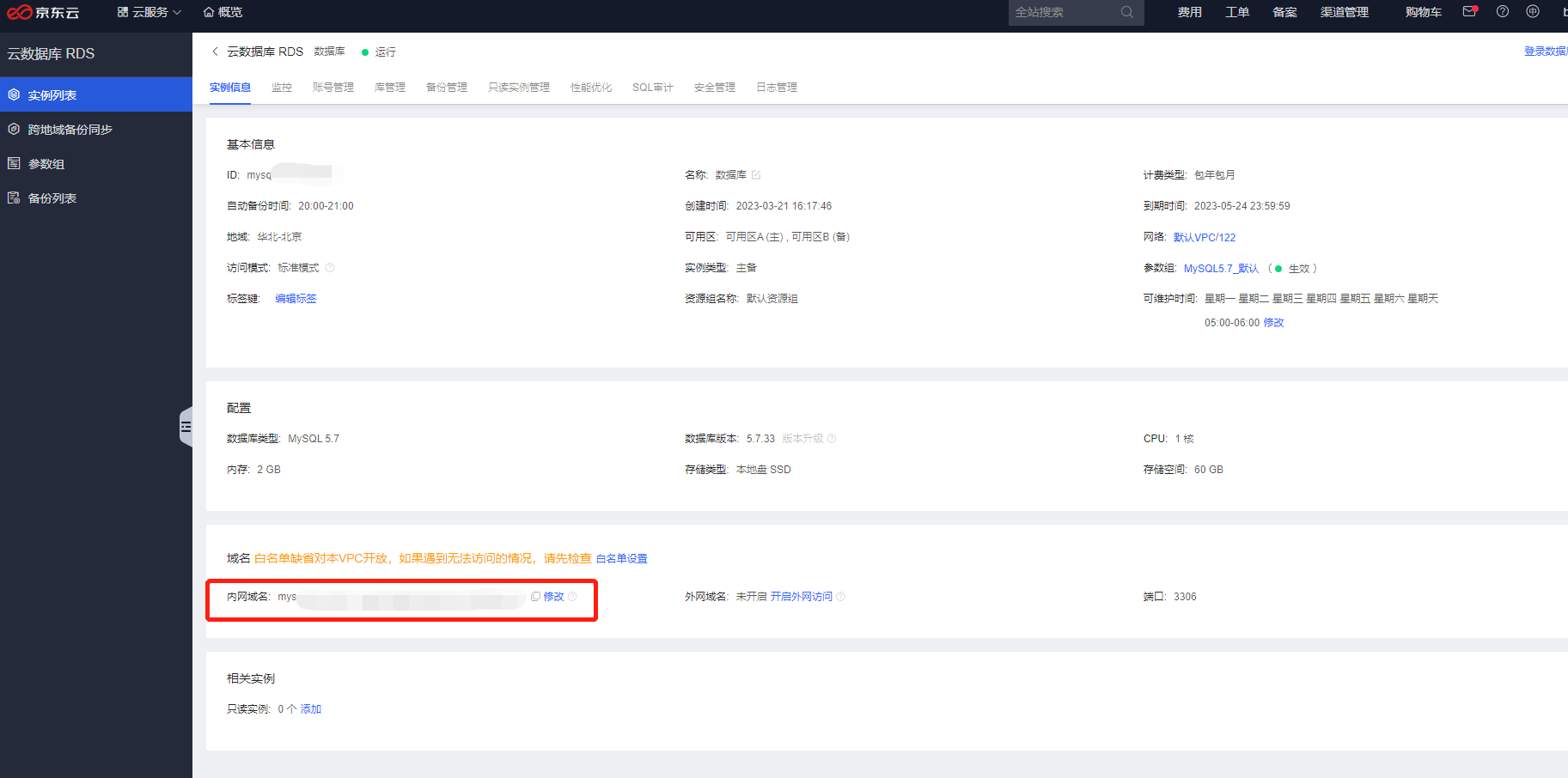 您在云主机上部署的Java应用,可以通过下图的内网域名链接数据库,账户和密码使用上面步骤刚创建的信息