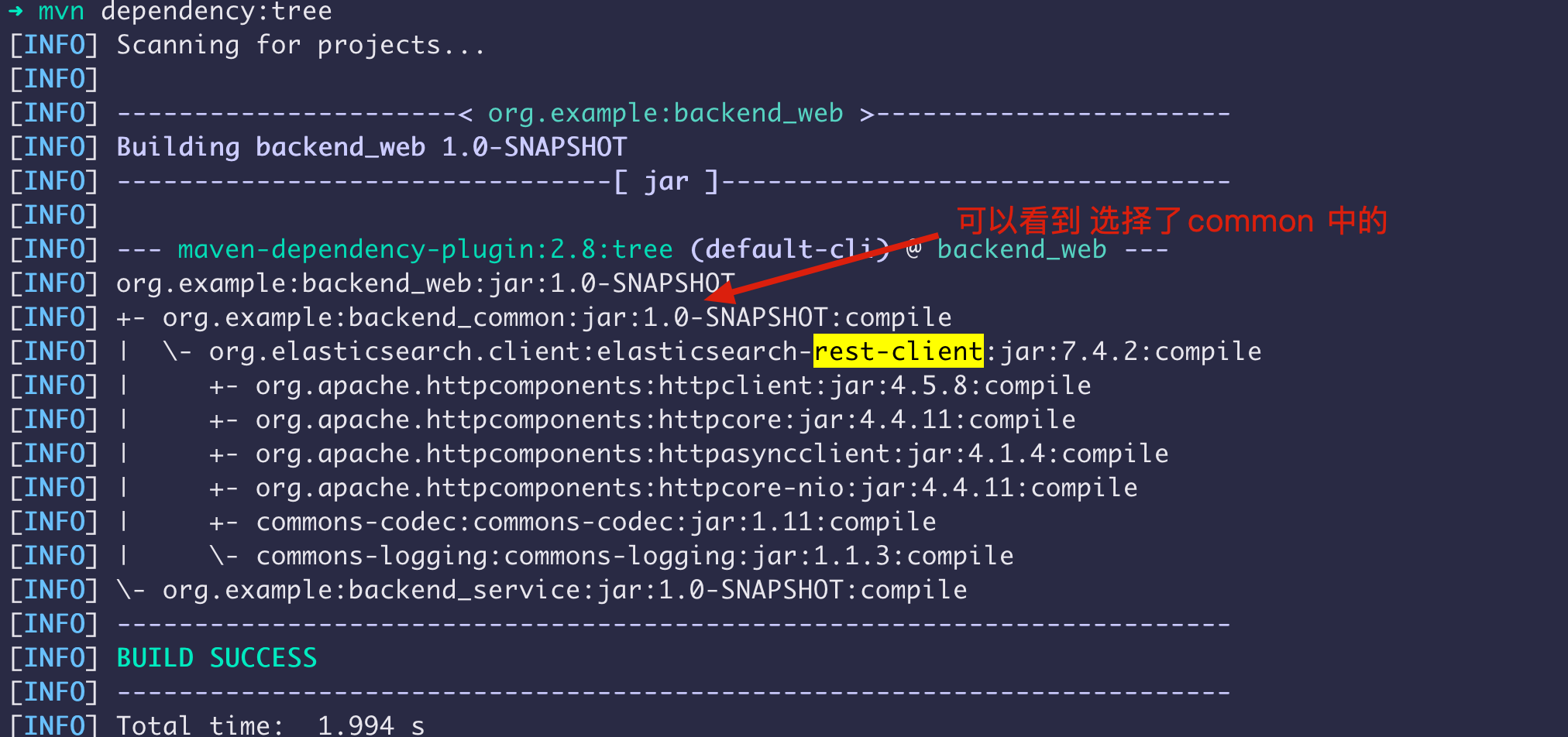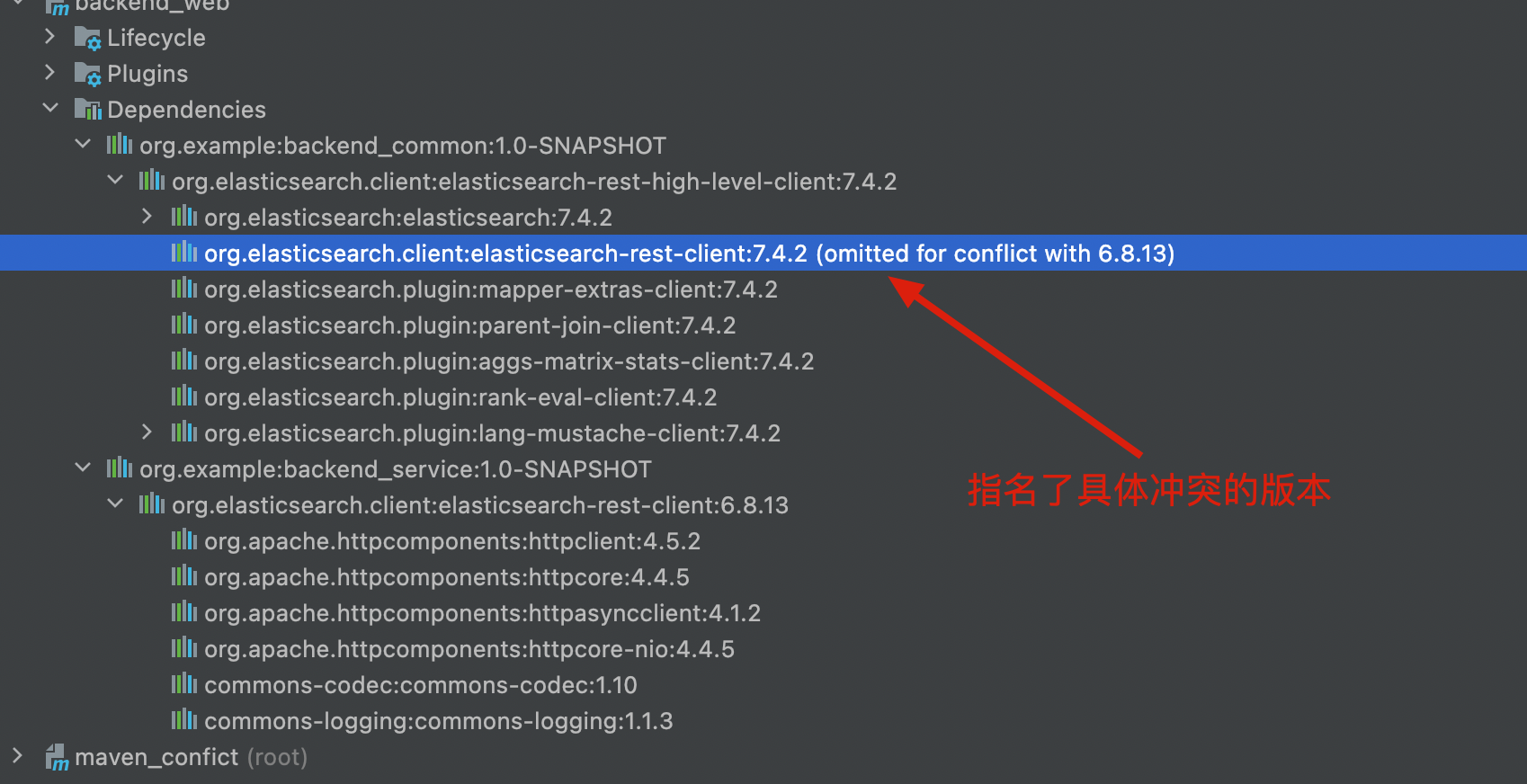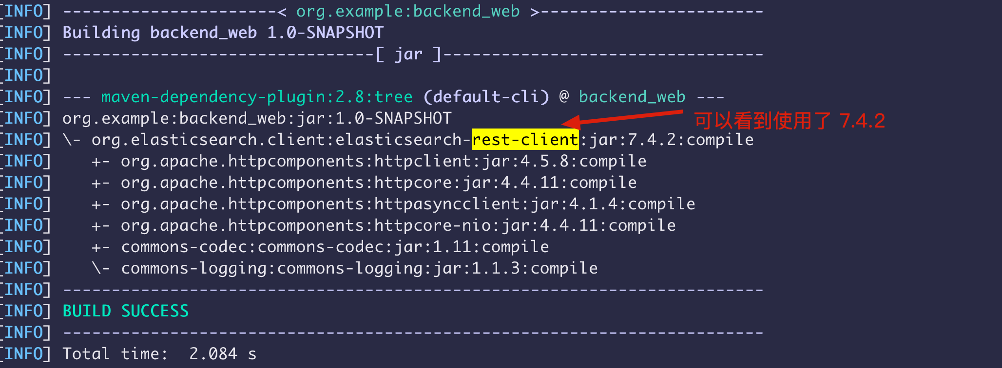 ▪观察加载结果图,发现实际加载的是es-rest-client 7.4.2, 即确实是common模块的声明生效,service模块后声明导致其中的es未被加载。符合声明优先原则;